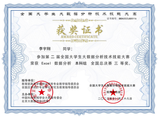 6. 2023年11月荣获第二届全国大学生大数据分析技术技能大赛国家级三等奖;