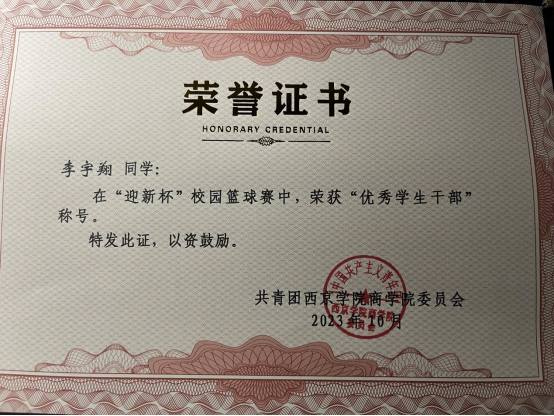 3. 2023年10月在迎新杯比赛中荣获“优秀学生干部”称号;