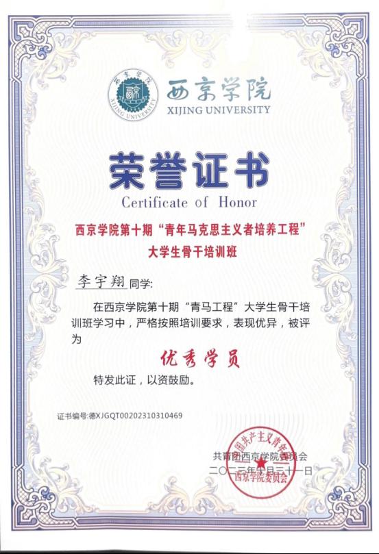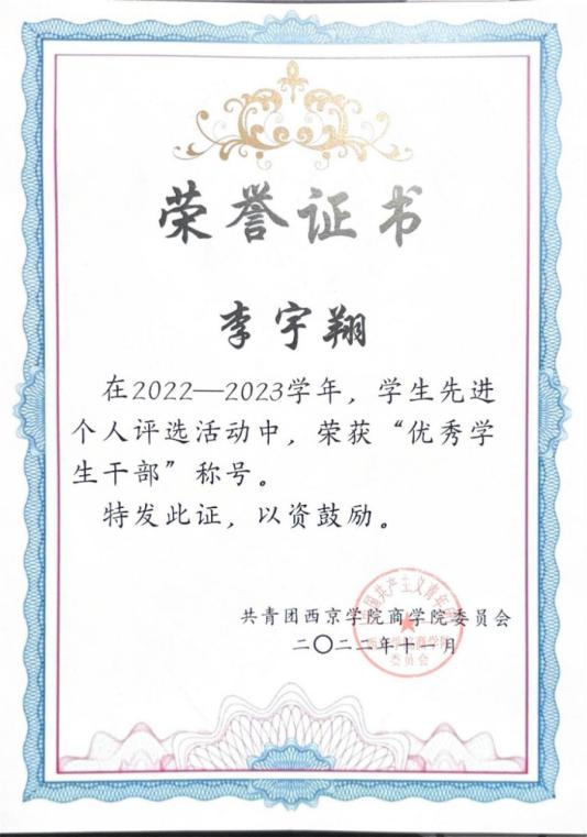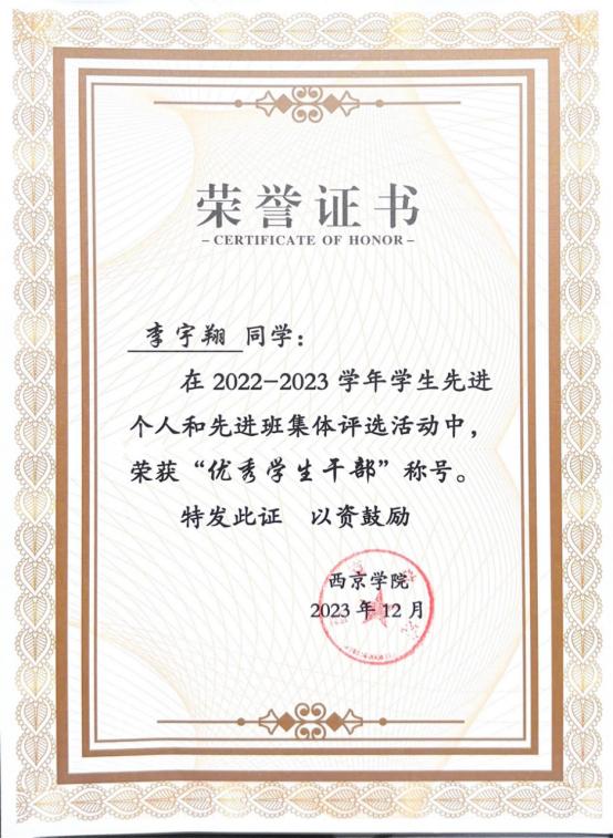 7. 2023年12月荣获西京学院2022-2023学年“优秀学生干部”称号;