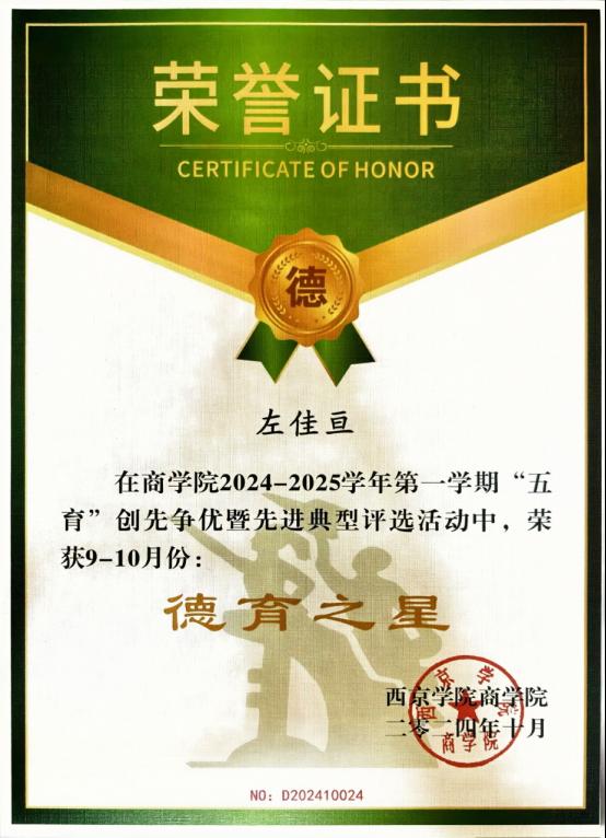8.2024年10月在商学院2024--2025学年第一学期“五育”创先争优暨先进典型评选活动中被评为“德育之星”;