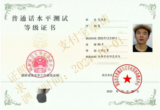 12.2023年12月,获得普通话测试等级证书;