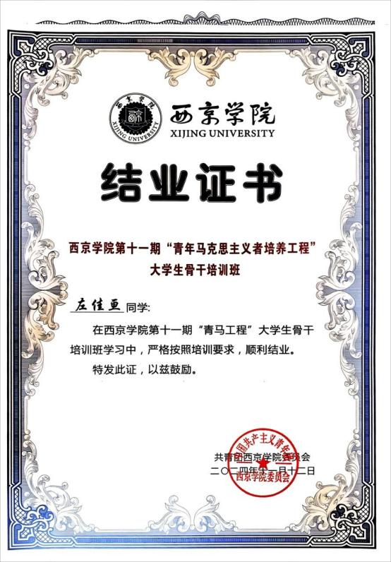 3.2024年11月获得西京学院第十一期“青年马克思主义者培育工程”大学生骨干培训班结业证书;