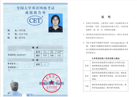 10. 2024年6月通过全国大学英语四级考试;
