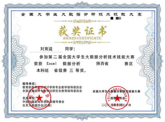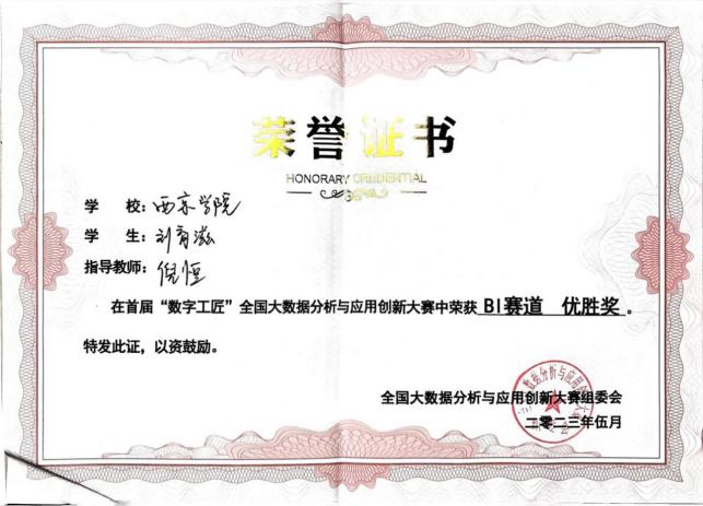 1. 2023年5月获全国大数据分析与应用大赛三等奖;